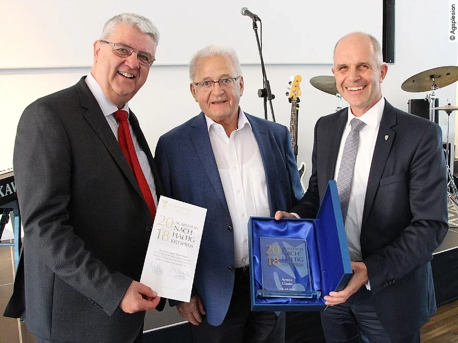 Pastor Reinhard Theysohn und Armin Clauss, früher hessischer Sozialminister. Beide Wegbereiter wurden nun im Rahmen einer feierlichen Abendveranstaltung im Anschluss an die Hauptversammlung und Aufsichtsratssitzung am 18. Juli in der Evangelischen Akademie Frankfurt am Römerberg mit dem erstmals verliehenen Agaplesion Nachhaltigkeitspreis geehrt.