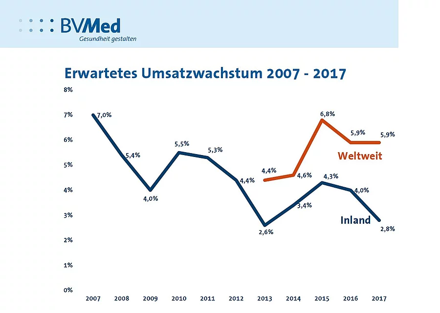 Die Medizintechnik-Branche sorgt sich zunehmend um den Standort Deutschland. Während die weltweite Umsatzentwicklung mit 5,9 Prozent auf dem Vorjahresniveau bleibt, schwächelt das Umsatzwachstum der Unternehmen im Inland. Nach den Ergebnissen der BVMed-Herbstumfrage liegt Deutschland nur bei 2,8 Prozent und damit deutlich unter den Vorjahreswerten.