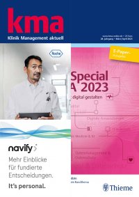 Herausgeber Dr. Olaf Bornemeier Vorstandsvorsitzender der Mühlenkreis- kliniken © Mühlenkreiskliniken Professor Dr. Axel Ekkernkamp Geschäftsführer Medizin der BG Kliniken und Ärztlicher Direktor des BG Klinikums Unfallkrankenhaus Berlin © Nolte / Ottobock Global Foundation Dr. Peter Gocke Chief Digital Officer (CDO), Leiter Stabsstelle Digitale Transformation Charité – Universitätsmedizin Berlin © Scott MacDonald Barbara Napp Pflegerische Zentrumsleitung Universitätsklinikum Hamburg- Eppendorf © UKE Beirat Andreas G. Henkel, Leiter Informationstechnologie, Universitäts klinikum Jena Thomas Kleemann, Leiter Informationstechnologie, Klinikum Ingolstadt IMPRESSUM kma Klinik Management aktuell März / April 2023 | 28. Jahrgang Die kma erscheint mit 8 Ausgaben in 6 Heften pro Jahr. ISSN (Print): 1439-3514; eISSN: 2197-621 Herausgeber Dr. Olaf Bornemeier, Prof. Dr. Axel Ekkernkamp, Dr. Peter Gocke, Barbara Napp Verlag Georg Thieme Verlag KG Rüdigerstraße 14, 70469 Stuttgart oder Postfach 301120, 70451 Stuttgart Tel.: 0711/89 31-0, Fax: 0711/89 31-298 www.thieme.de, www.thieme.de/kma www.thieme-connect.de/products Web-App: www.thieme.de/eref-app Redaktion Georg Thieme Verlag KG Luisenstraße 58/59, 10117 Berlin Tel.: 030/33 09 19-0, Fax: 030/33 09 19-29 E-Mail: redaktion-kma@thieme.de V.i.S.d.P.: Anna Herrschelmann (hna): anna.herrschelmann@thieme.de Redaktion: Guntram Doelfs (dsg), Susann Eilers (ess), Aileen Hohnstein (hoh), Luisa-Maria Hollmig (hgl), Julia Gassmann (gnj), Lisa-Marie Hofmann (hnl), Martin Kucera (mk), Jens Kohrs (koj), Julia Keller Grafik: Ina Naradowskaja, Ursula Schicke, Christina Weineich Produktionsmanagement Ursula Schicke Verantwortlich für den Anzeigenteil Thieme Media Pharmedia Anzeigen- und Verlagsservice GmbH Lutz Benecke, Tel.: 0711/89 31-954, lutz.benecke@thieme-media.de Es gilt die Anzeigen-Preisliste Nr. 28 vom 1.1.2023 Abonnentenservice Tel.: +49 711/89 31-321, Fax: +49 711/89 31-422, https://kundenservice.thieme.de Die Inhalte der Zeitschrift stehen online in Thieme connect zur Verfügung (www.thieme-connect.de/ products). Der Zugang ist für persönliche Abonnen- ten im Preis enthalten. Die Zeitschrift und alle in ihr enthaltenen einzelnen Beiträge und Abbildungen sind für die Dauer des Urheberrechts geschützt. Jede Verwertung außer- halb der engen Grenzen des Urheberrechtsgesetzes ist ohne Zustimmung des Verlages unzulässig und strafbar. Das gilt insbesondere für Vervielfältigung und Verbreitung in gedruckter Form, Übersetzung, Übertragung und Bearbeitung in andere Sprachen oder Fassungen sowie die Einspeicherung und Verbreitung in elektronischen Medienformen (z. B. CD-Rom, DVD, USB-Speicher, Datenbank, cloud- basierter Dienst, e-book und sonstige Formen des electronic publishing) und auch öffentlicher Zugäng- lichmachung (z. B. Internet, Intranet oder andere lei- tungsgebundene oder -ungebundene Datennetze), u. a. durch Wiedergabe auf stationären oder mobilen Empfangsgeräten, Monitoren, Smartphones, Tablets oder sonstigen Empfangsgeräten per Download (z. B. PDF, ePub, App) oder Abruf in sonstiger Form etc. Printed in Germany / Druck und Bindung Grafisches Centrum Cuno GmbH & Co. KG, Gewerbering West 27, 39240 Calbe (Saale) Bildnachweis Cover © The image was composed by Thieme using following images: Waben © pixtumz88/ stock.adobe.com; Wellen © phyZick / stock.adobe.com Organ folgender Fachgesellschaften und Verbände: Deutsche Gesellschaft für Integrierte Versorgung im Gesundheitswesen e.V. (DGIV); Arbeitskreis für Gesundheitsökono mie und -management e.V. (AK- GM); Deutsche Gesellschaft für Führung und Markt- orientierung in der medizinischen und pflegerischen Versorgung e.V. (DGFM e.V.); CAMBAlumni e.V. Verbandsnachrichten und Fachbeiträge Die Nachrichten und Fachbeiträge auf den Verbands- seiten unterliegen der Verantwortung der benannten Person der jeweiligen Gesellschaft. Datenschutz Wo datenschutzrechtlich erforderlich, wurden die Namen und weitere Daten von Personen redaktionell verändert (Tarnnamen). Dies ist grundsätzlich der Fall bei Patienten, ihren Angehörigen und Freunden, z. T. auch bei weiteren Personen, die z.B. in die Behand- lung von Patienten eingebunden sind. Preise 2023 pro Jahr (inkl. gesetzl. MwSt.) Persönlicher Jahresbezugspreis: 135 €, IJBP: 913 €, Studenten/Schüler: 63 €, Einzelheftpreis: 23 €, Versandkosten Inland: 8,30 €, Versandkosten Europa/ Übersee: 36,90 € Der institutionelle Jahresbezugspreis inkludiert den Online-Zugriff für den gesamten Standort. Abon- nements können mit einer Frist von 3 Monaten zum Kalenderjahresende gekündigt werden. Zur Wahrung der Frist genügt das rechtzeitige Absenden der Kün- digung. Nicht rechtzeitig gekündigte Abo nne ments verlängern sich um ein weiteres Kalenderjahr. Deutsche Gesellschaft für Führung und Marktorientierung Eigentümer & Copyright Wenn nicht anders angegeben: © 2023. Thieme. All rights reserved. Die Zeitschrift kma Klinik Management aktuell ist Eigentum von Thieme. Georg Thieme Verlag KG, Rüdigerstraße 14, 70469 Stuttgart, Germany Ausblick ▪ Impressum Die nächste kma erscheint am 1. Juni 2023 u.a. mit folgenden Themen: Lösungen für den Fachkräftemangel kma widmet sich in der nächsten Ausgabe den Ursachen des Fachkräftemangels und der Frage, wie ihm zu begegnen ist, ohne Abstriche beim Versorgungsstandard hinnehmen zu müssen. In einer Serie zu dem Thema stellen wir in den kommenden Ausgaben der kma digitale Lösun- gen vor, die Ärzte und Pflegekräfte entlasten und zeigen, wie ein veränderter Führungsstil die Fachkräfteflucht verringern kann. Außerdem beleuchten wir neue Wege bei der Mitarbeiter- gewinnung im In- und Ausland und erläutern, wie es gelingt, ausländisches Fachpersonal schnell zu integrieren. Rückblick: Die Arbeit des Innovationsfonds 160 Millionen Euro Fördersumme stehen dem G-BA für die Jahre 2020 bis 2024 zur Förderung und Entwicklung neuer digitaler Versorgungs- formen zur 